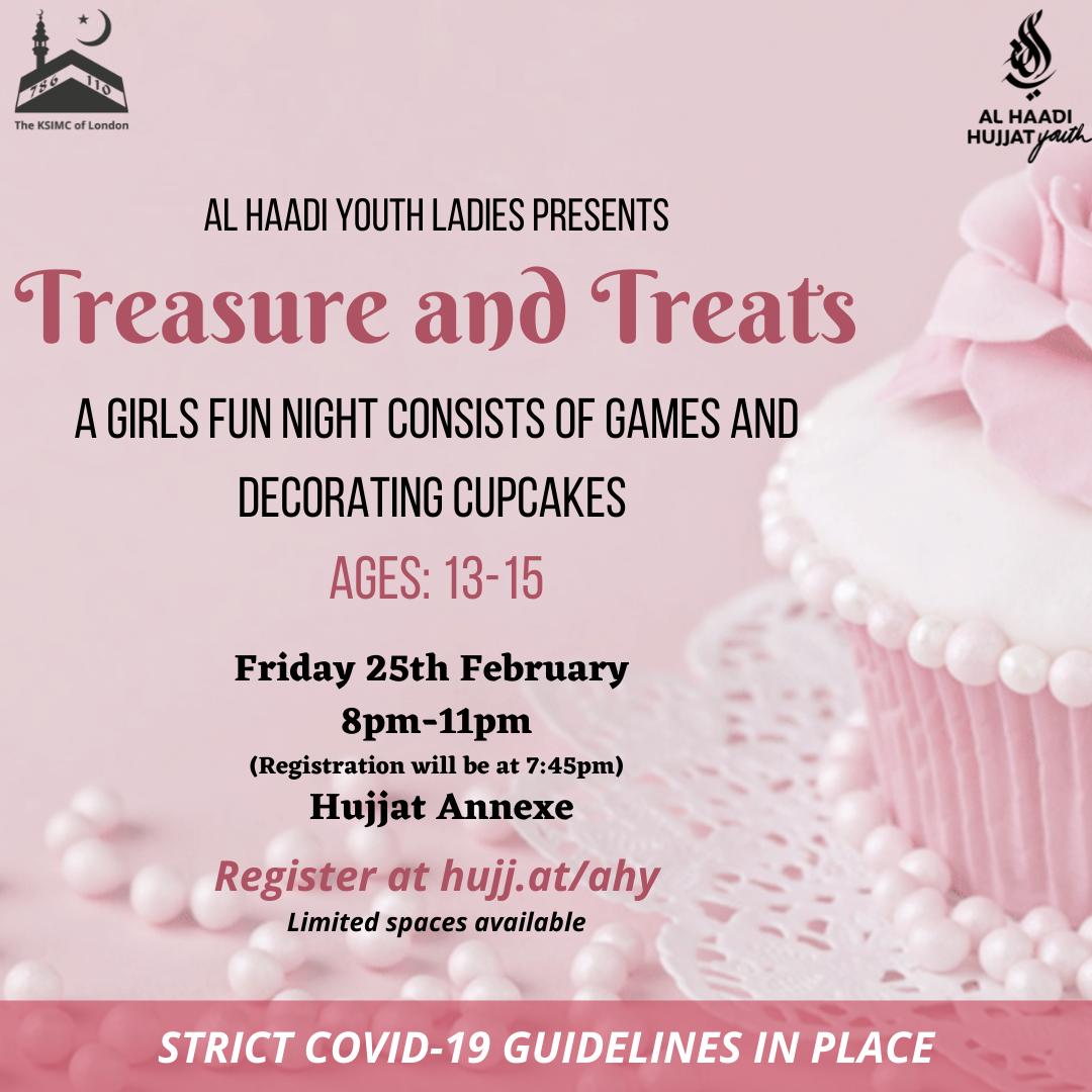 Al Haadi Youth brings you the first girls social of the year: Treasure and Treats! Join us in an intense Treasure hunt around the mosque and challenge yourself with the art of decorating cupcakes!! Limited Spaces Available 🙂