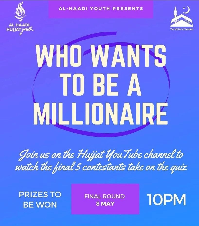 In: Al Haadi Hujjat Youth, Hujjat, Not on home pageJoin us live on Saturday 8 May 2021 at 10pm on the Hujjat YouTube Channel as the finalists battle it out in the Who Wants To Be A Millionaire Final.