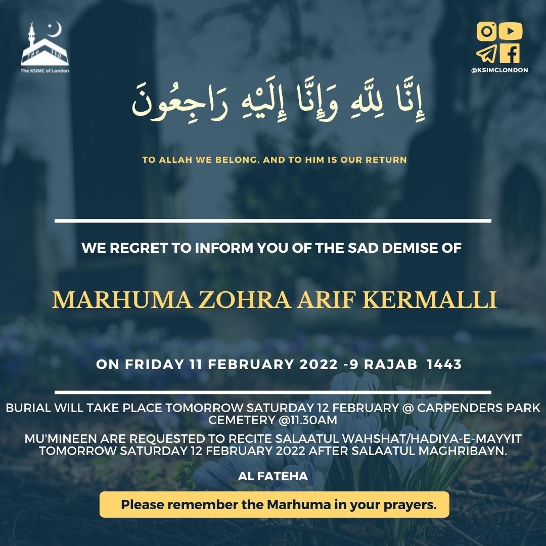 We regret to inform you of the sad demise of Marhuma Zohra Arif Kermalli passed away today in London and will be buried tomorrow Saturday 12 February @ Carpenders Park Cemetery @11.30am
