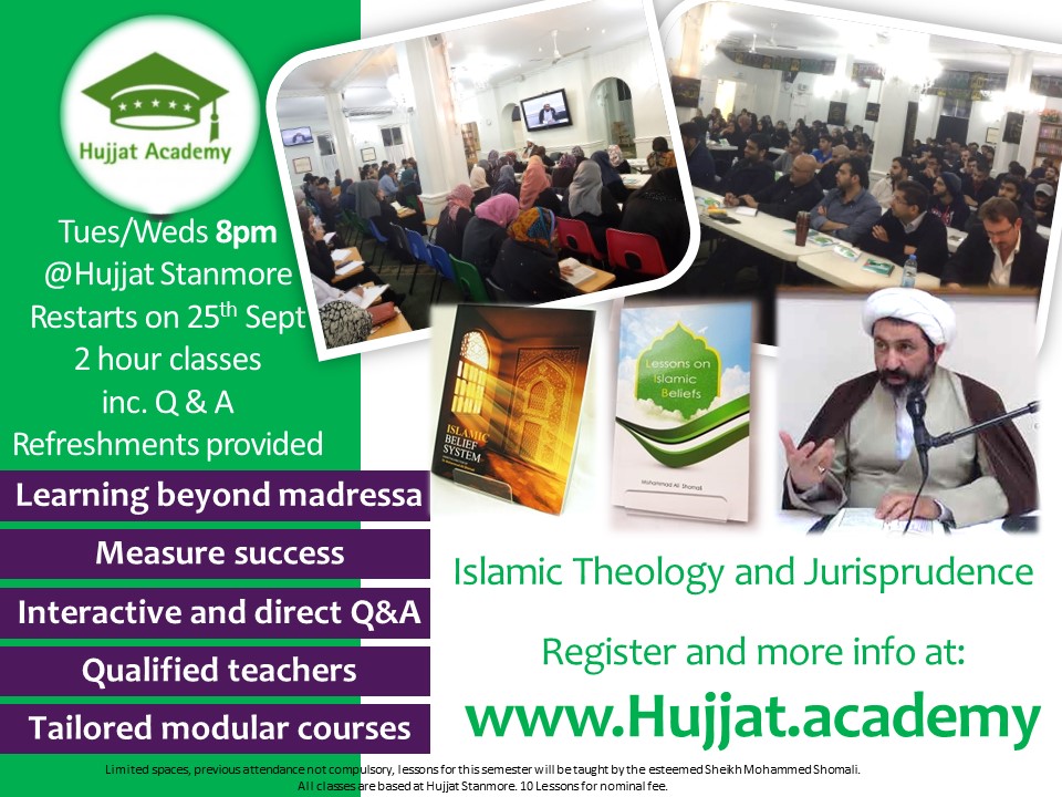 In: UncategorizedHujjat Academy returns on 25th September with 10 lessons covering topics such as Ma’ad (resurrection), the 12th Imam (A) and Usul al Fiqh. Places are open to all but are going fast! To register, and for more info, please visit: http://hujjat.academy/registration/