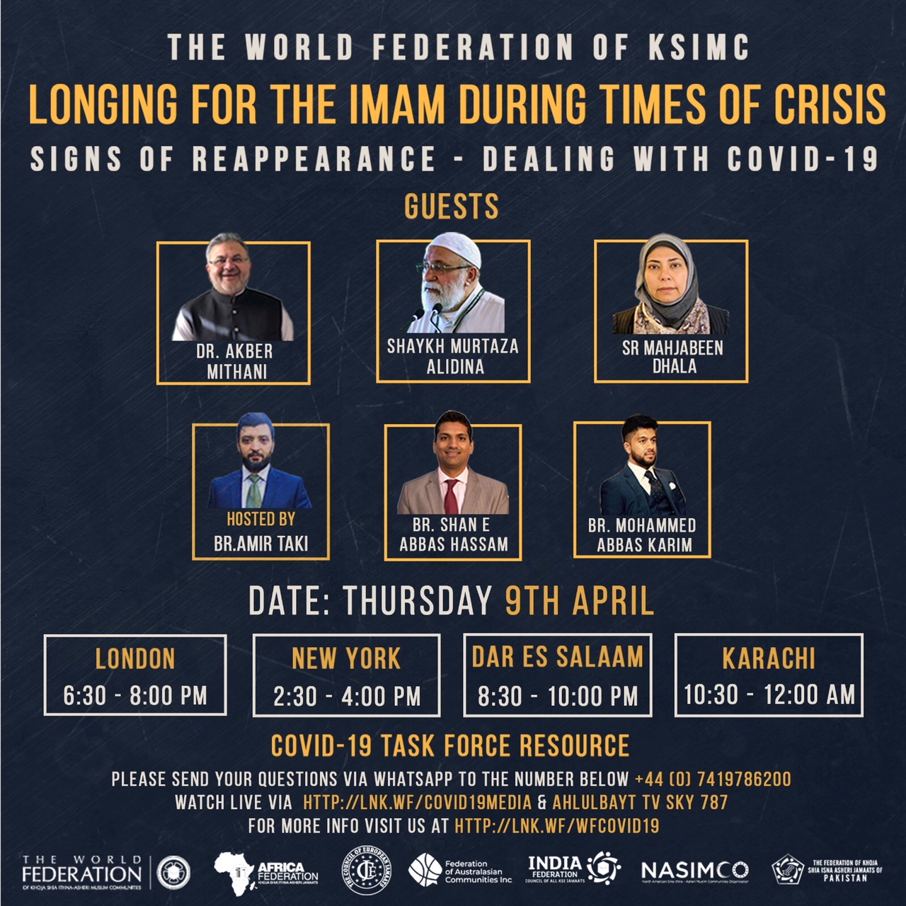 In: UncategorizedThe WF has organised a seminar today at 6.30PM which will be broadcast on the Hujjat Livestream: ‘Longing for the Imam during Times of Crisis: Signs of Reappearance – Dealing with COVID19’ with Shaykh Murtaza Alidina, Sr Mahjabeen Dhalla, Dr Akber Mithani, Br Shan e Abbas Hassam, Br Mohammed Abbas Karim, hosted by Br Amir Taki.