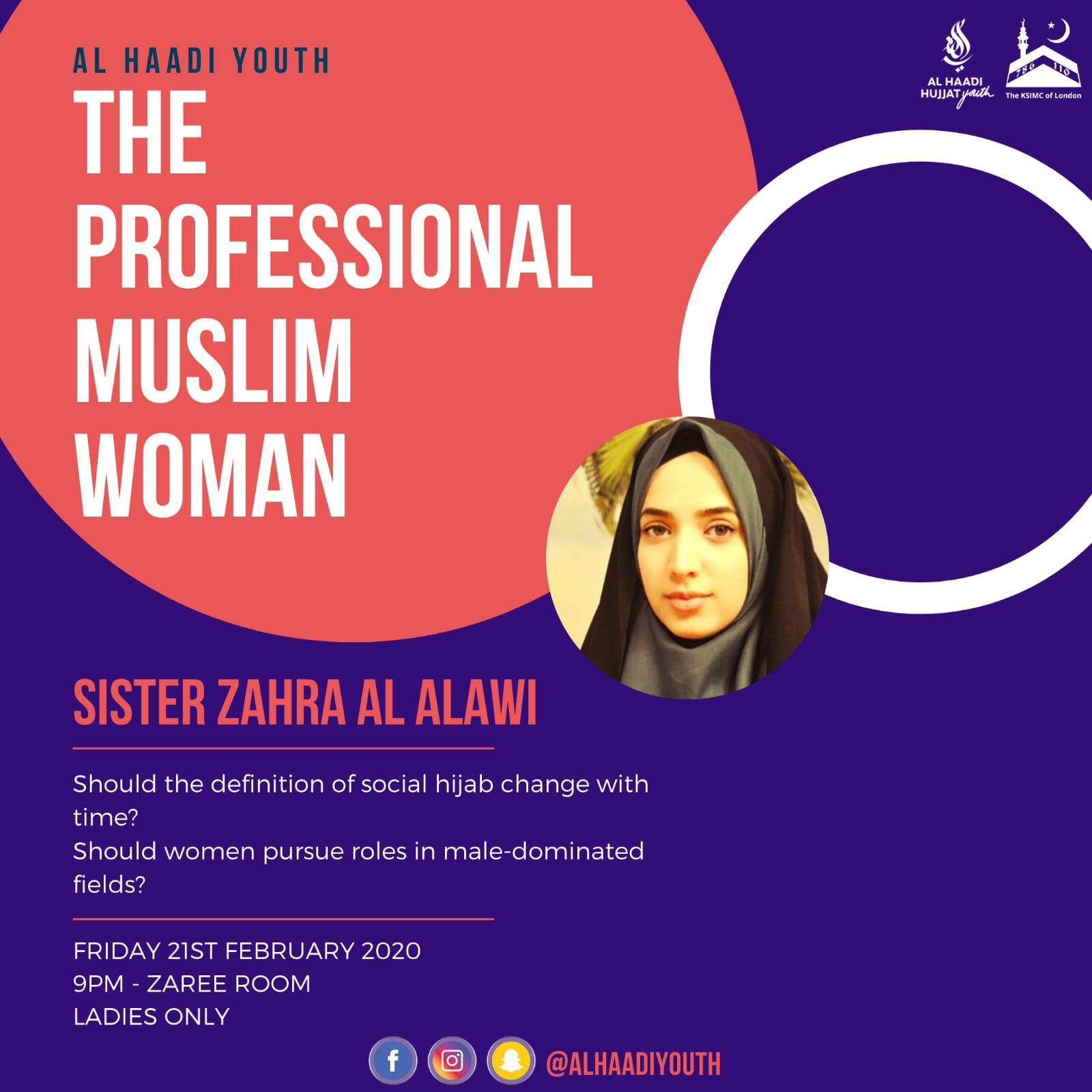 Should the definition of social hijab change with time? Should women pursue roles in male dominated fields? How far should a woman balance her career and her many other responsibilities? Join us on *Friday 21st February at 9pm* as we sit down with Sister Zahra Al-Alawi and discuss important, relevant issues facing Muslim working women every day.